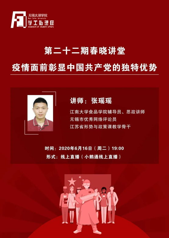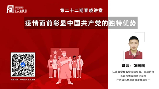 本期的春晓讲堂主讲人张瑶瑶老师,将从中国共产党执政理念、制度特点、党的先进性等,多角度、多层面为大家深入讲解疫情面前中国共产党所彰显的独特优势。藉此帮助我校学生更客观、全面、理性地认识疫情防控工作,深刻体会中国共产党制度的独特优势,增强学生对于中国特色社会主义道路自信、理论自信、制度自信、文化自信的认识。更好地践行中国特色社会主义文化道路,建设中国特色社会主义理论体系,创建中国特色社会主义文化。
