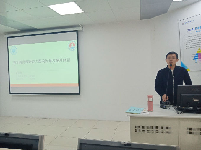 随后,张天明博士进行发言,他以青年教师科研能力影响因素及提升路径为题,将科研能力作为切入点,分析了科研能力有降无升是由于科研本身需要专业学术训练,而如今大量青年教师缺乏此训练。他表示投入不一定会产生期望的产出,即使有也不能在短期内产生所需要的经济效益与社会效益,其次年轻教师刚参加工作,生活压力大,无法更多聚焦科研。对于这个现象,他提出了几种提升科研工作效率的有效途径如从自身与环境出发,提高年轻教师的科研能力。