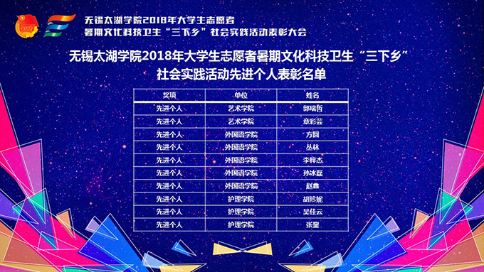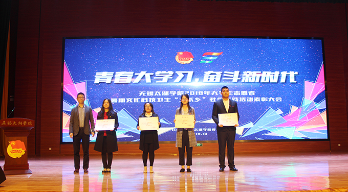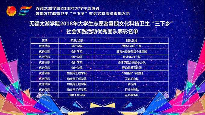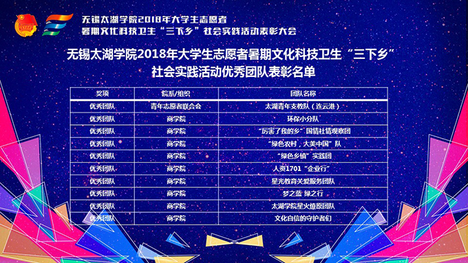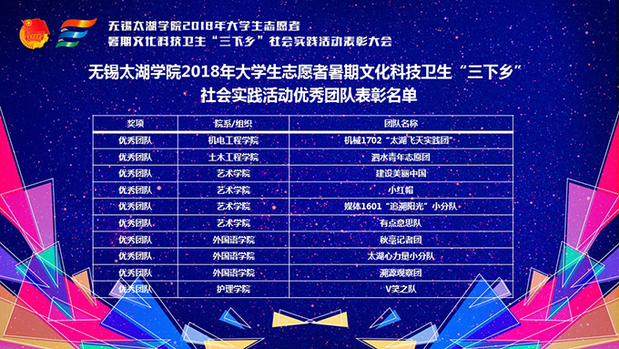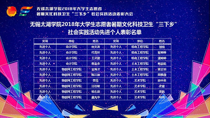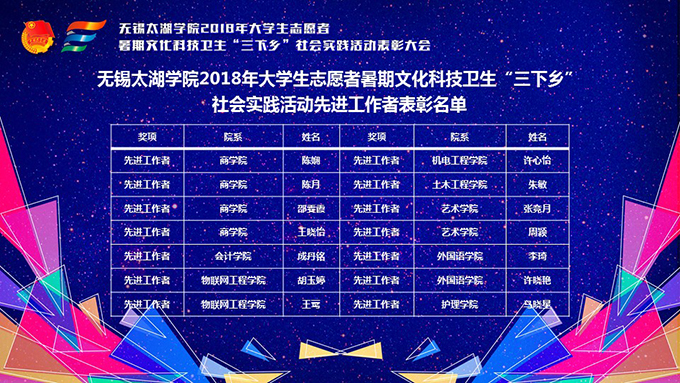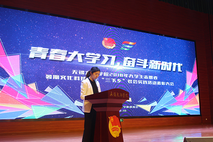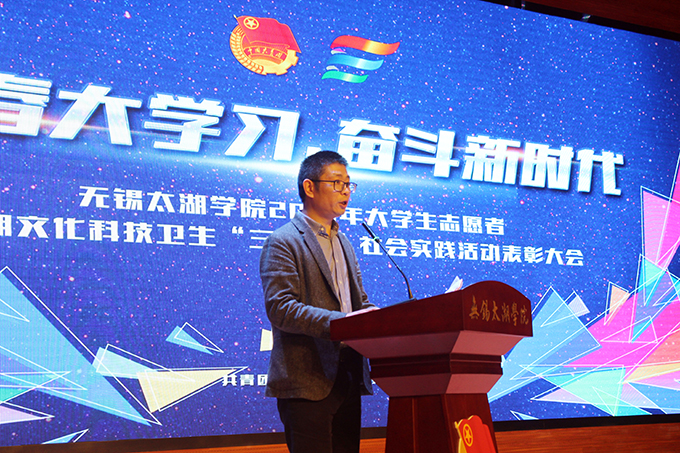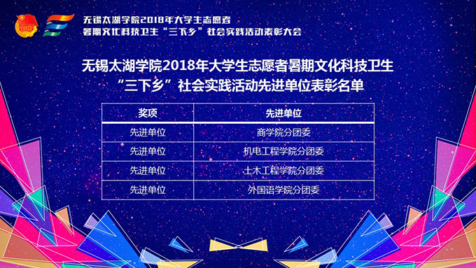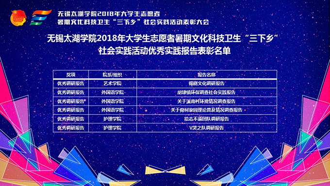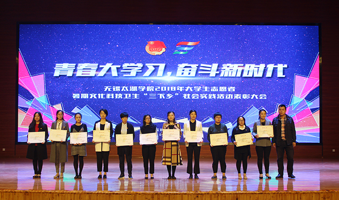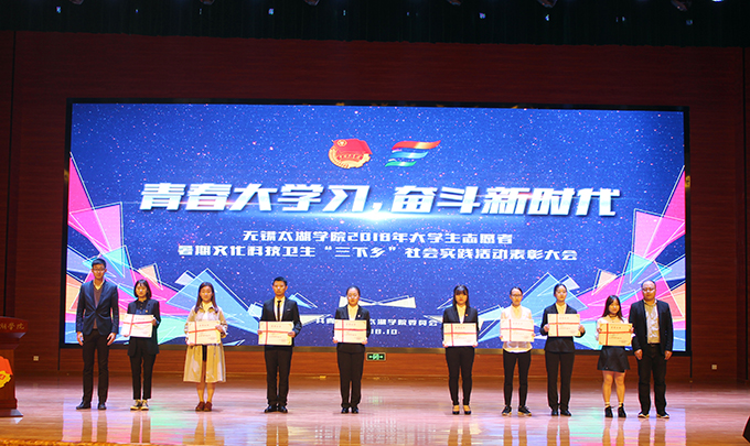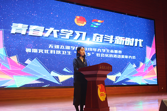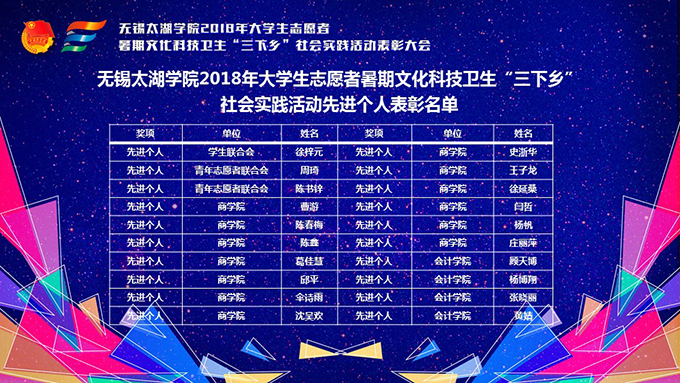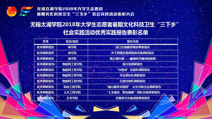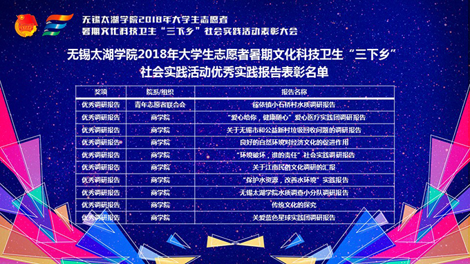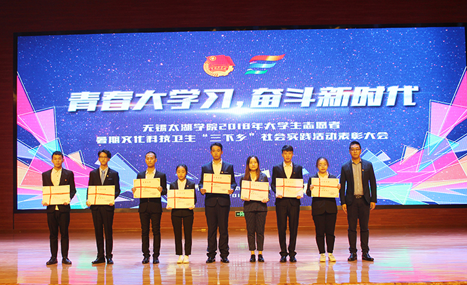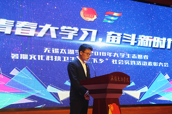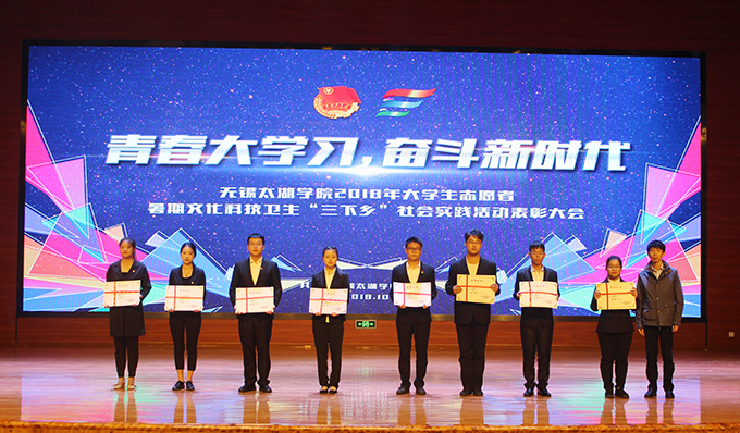 会议伊使,校团委副书记陈朕宣读《2018年“三下乡”暑期社会实践活动表彰决定》。表彰决定授予商学院分团委、机电工程学院分团委、土木工程学院分团委、外国语学院分团委4个团学组织“社会实践先进单位”荣誉称号,授予太湖青年(连云港)支教队等30支队伍“社会实践优秀团队”荣誉称号,授予徐梓元等50名同学“社会实践先进个人”荣誉称号,授予陈娴等14名教师“社会实践先进工作者”荣誉称号,授予“无锡市残疾人托养中心”等9处社会实践基地“优秀社会实践基地”荣誉称号,授予《稼依镇小石桥村水质调研报告》等26篇社会实践调研报告“优秀实践报告”荣誉称号。同时,陈书记表示希望受表彰的先进个人和集体珍惜荣誉,再接再厉,进一步加强我校社会实践活动内涵建设,注重深度、创新模式、深化成果、扩大影响,为推动我校暑期社会实践活动迈上新台阶做出贡献。