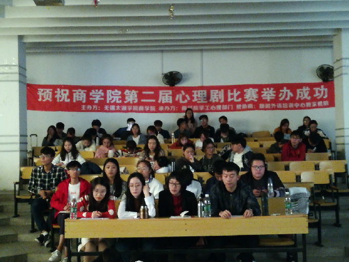 本次心理剧的主题关于是宿舍问题、校园贷、人际关系、校园暴力等一些校园常见问题。而心理剧是一种团体心理治疗技术,参与者通过表演话剧的方式,将心理问题和事件表达出来,让参与者和观众都可以通过这种方式达到宣泄情绪、减轻压力的目的本次比赛非常荣幸能够由陈平老师、朱思齐老师、宋宜娜老师、聂雨苗老师这四位老师担任评委,老师们以严谨认真的态度要求每一个节目,选出最优秀的剧目代表商学院比赛。这次活动是由商学院学工助理团主要负责的,每位工作人员有条不紊进行自己的工作,及时处理突发状况,保证现场秩序。