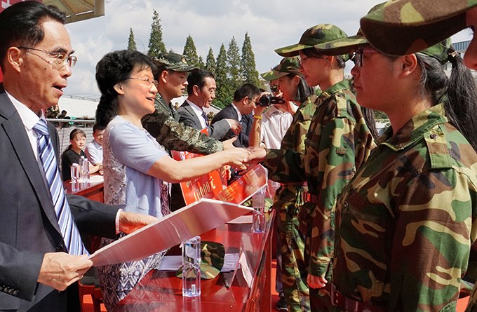 旅游管理1801班赵梓含同学代表2018级全体参训新生发言,向共度十五天军训时光,为训练付出辛苦劳动的教官们致以最崇高的敬意和衷心感谢!她说,感谢学校精心部署和周到安排,我们一定会以“自强不息,经世致用”的校训为帆,认真地对待每一堂课的学习,体验多彩的社团活动,向着人生的下一个高峰努力攀登,在太湖谱写出华美的人生乐章!(党委宣传部)