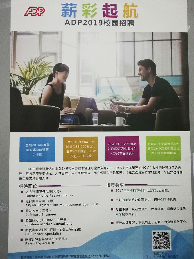 此次的ADP校园招聘会不仅为应届毕业生提供了一定的就业机会,同时让同学们了解到提升自身综合实力的必要性。ADP负责人的宣讲更让大家懂得“与优秀的人一起工作,自己也会不断得到提高”的道理,使即将进入社会的应届毕业生们受益匪浅。