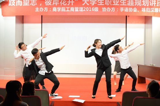本次活动流程为:情景剧《面试风波》展示、邱黠冰学姐分享入职规划、手语表演《明天,你好》、初二先生分享创业规划、汉服舞表演、“你问我答”问题解答、朗诵 古筝 书法展示、辅导员致辞八个环节。