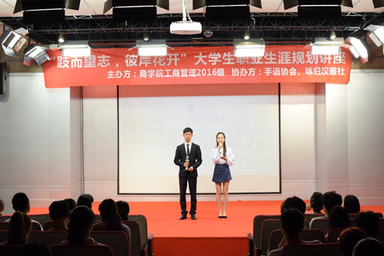 本网讯 5月14日下午一点半由16级工商管理专业主办,手语协会、咏归汉服社协办的“跂而望志,彼岸花开”大学生职业生涯规划讲座在南区音乐中心成功举行。此讲座以加强同学们对就业形势的认识和为想要创业的同学们提供建议为主题,邀请了邱黠冰学姐和初二先生亲临现场与同学们分享他们的经历经验。