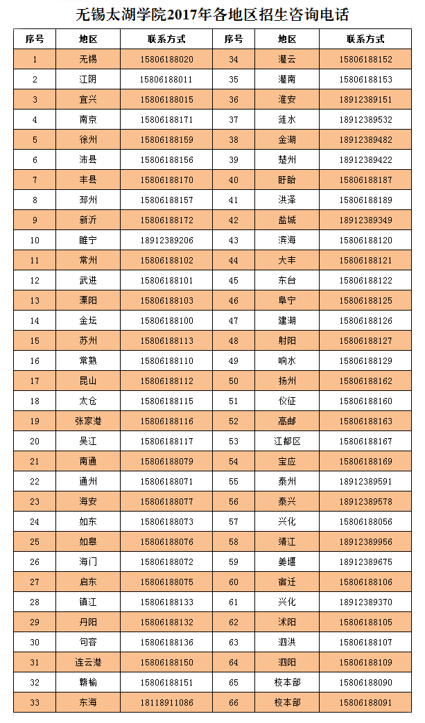 无锡太湖学院2017年各地区招生咨询电话