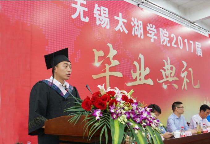 “丰富多彩的太湖校园是一个大熔炉,为我们锻造出与众不同的精彩人生。”2017届毕业生代表、商学院旅游133班的朱思齐上台发言。他说四年的大学生活,收获了青春最美的回忆,收获了最纯真的友谊,收获了勇敢和自信。在这四年中,学校变化非常大,校园美得像公园,公园建在校园里,可以自豪地说,太湖学院是全省最美的大学之一。真诚的话语表达了对母校的眷恋之情、对老师的感激之情,并对学校未来的发展送上了美好的祝愿。