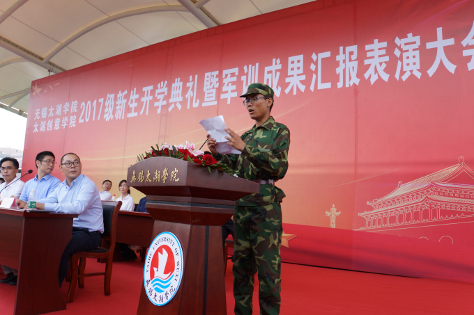 本网讯 9月22日下午,无锡太湖学院北区运动场上青春洋溢,激情飞扬,2017级新生开学典礼暨军训成果汇报表演大会在这里隆重举行。学校党委书记金秋萍,校长徐从才,驻锡某部首长牛琳,校领导何宏金、陈志龙、金成、丁涛、陈鹏飞、陈晓东在大会主席台前排就座,学校各二级学院、职能部门负责人以及2017级全体新生、军训教官出席大会。