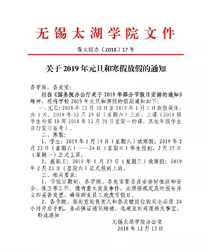 关于2019年元旦和寒假放假的通知