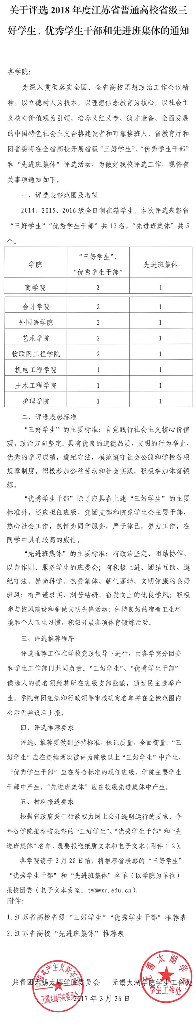 关于评选2018年度江苏省普通高校省级三好学生优秀学生干部和先进班集体的通知